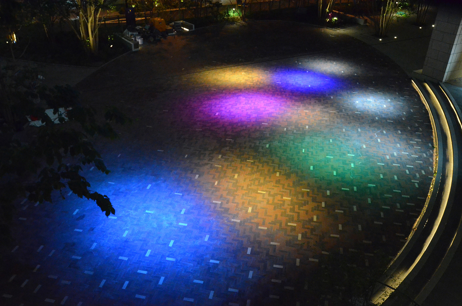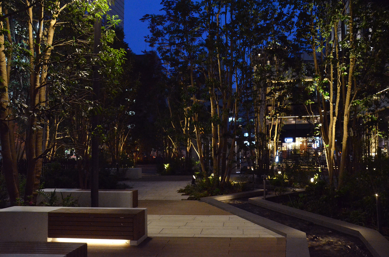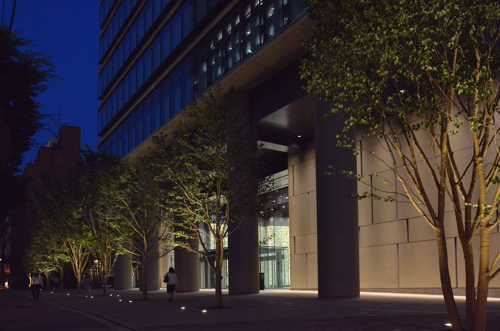 神保町駅にほど近く周辺には出版社、古書店、大学といった文化と文教の色濃い神田錦町の地に誕生したテラススクエアはまとまりのある緑豊かな広場を備え、近代の面影を今に伝える博報堂旧本館の復元建物が特徴的なオフィスビルである。照明計画はオフィスビルの外観、低層の業務、商業のパブリックエリア、外構に至る敷地全体を対象としている。外観照明は南面の水平庇、頂部庇に光を配し、東面の石壁照明とともに夜の姿を印象づけている。飲食エリアのテラス席と一体感のある広場には超狭角のカラースポットライトを設え、通常、季節イベント対応などプログラム運用されている。豊かな緑陰のランドスケープエリアはアートや水路を中心に修景的な光で構成している。これら賑わいと安らぎの光が開放的な空間に人を呼び、地域のコア施設として活性化の一翼を担っていくことに期待したい。