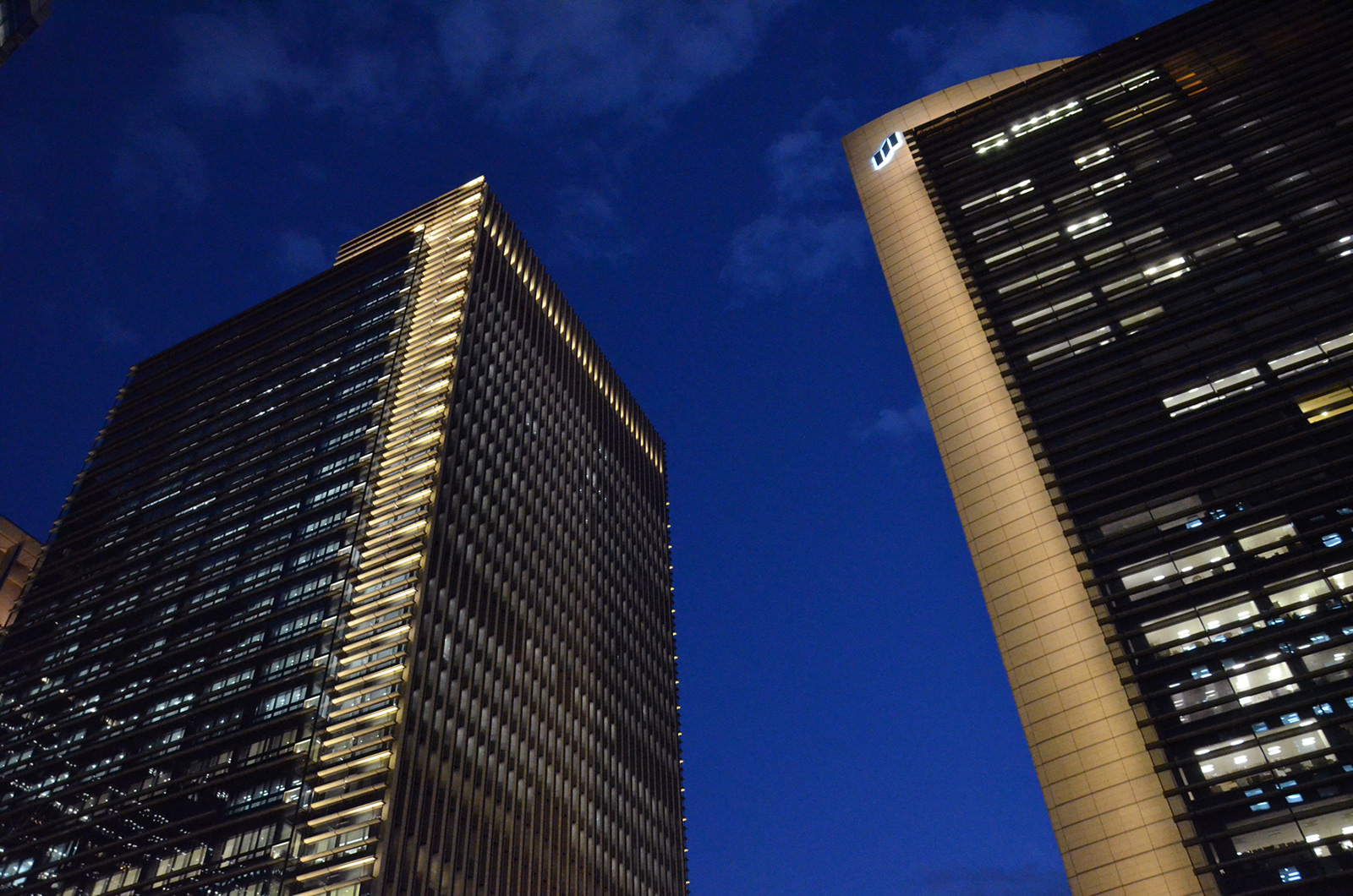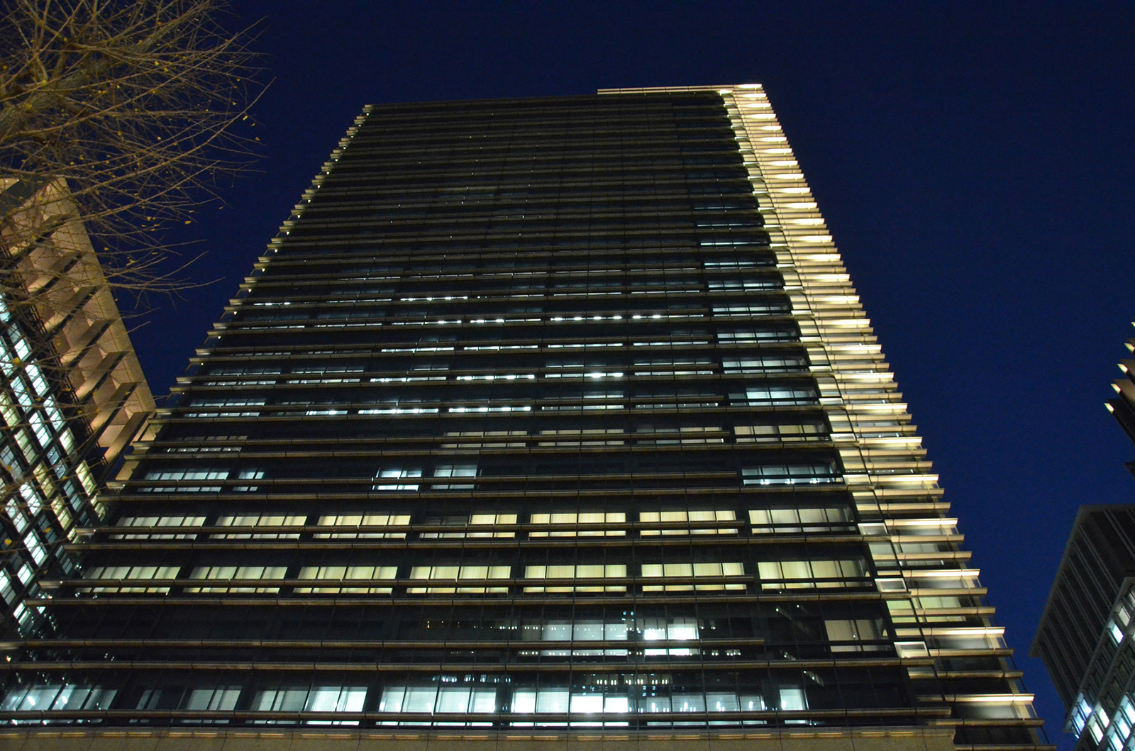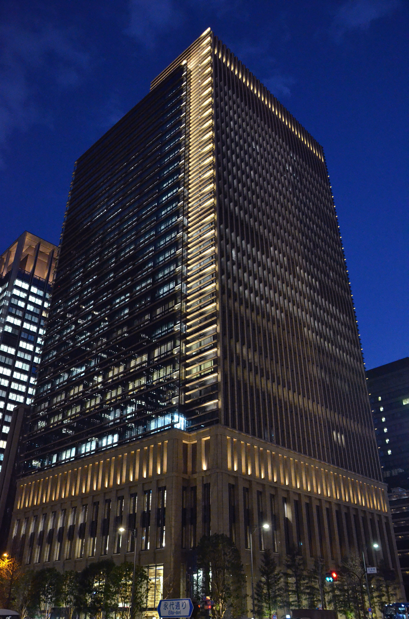 2010年に完成した本店ビルと日比谷通りを挟んで対を成すように計画された東館がこのほど竣工した。本店と比べ建物最高高さが150mと高くなっているが、建築外観のデザインテイストが共有されておりとりわけ交差点に面するコーナー部のデザインは2棟の関連性を位置づける上で重要である。外観照明はこの北西コーナーを主体に建物外観のエッジを際立たせ、交差点や周辺街路からのビスタに効果的な表情を創出している。また歴史的景観の継承として計画された低層部のデザインを生かした光を設えることで統一感のある街並み形成に貢献している。加えて、建物足元周りには樹木、ボラード、階段などに光を配し親しみのわく表情を創りだしている。