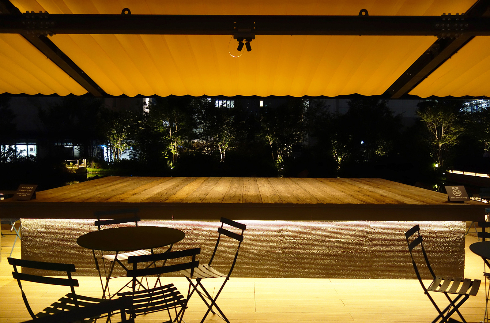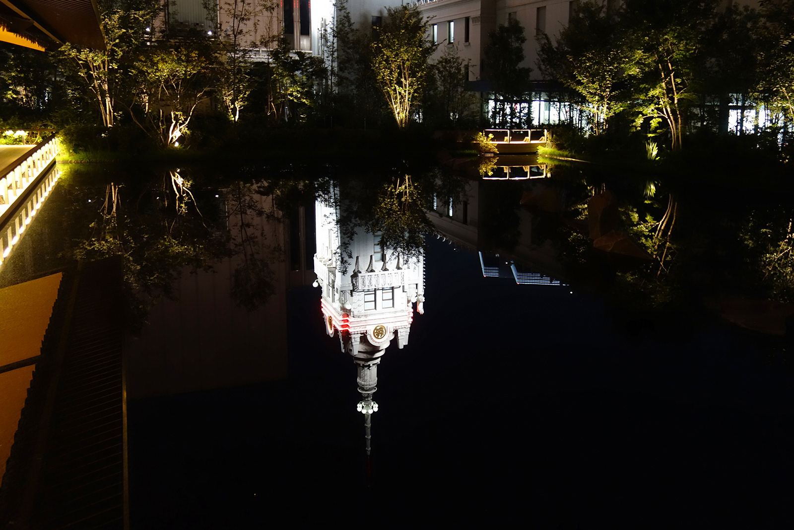 五街道の起点ともなった日本橋はいまダイナミックに街づくりが進行中である。その賑わいの拠点でもある老舗百貨店の屋上に池泉回遊式庭園が誕生した。屋上とは思えないほどの豊かな緑に大きな水面の水景施設が特徴的である。また深い庇をもつ集いの広場はフードコートとして多くの人に利用されている。大庇にはアップアンドダウンの照明が備えられ広場の用途に応じて運用される。回遊式庭園は樹木や通路の濃淡のある光の分布が大水面に映り都会の夕景を彩っている。