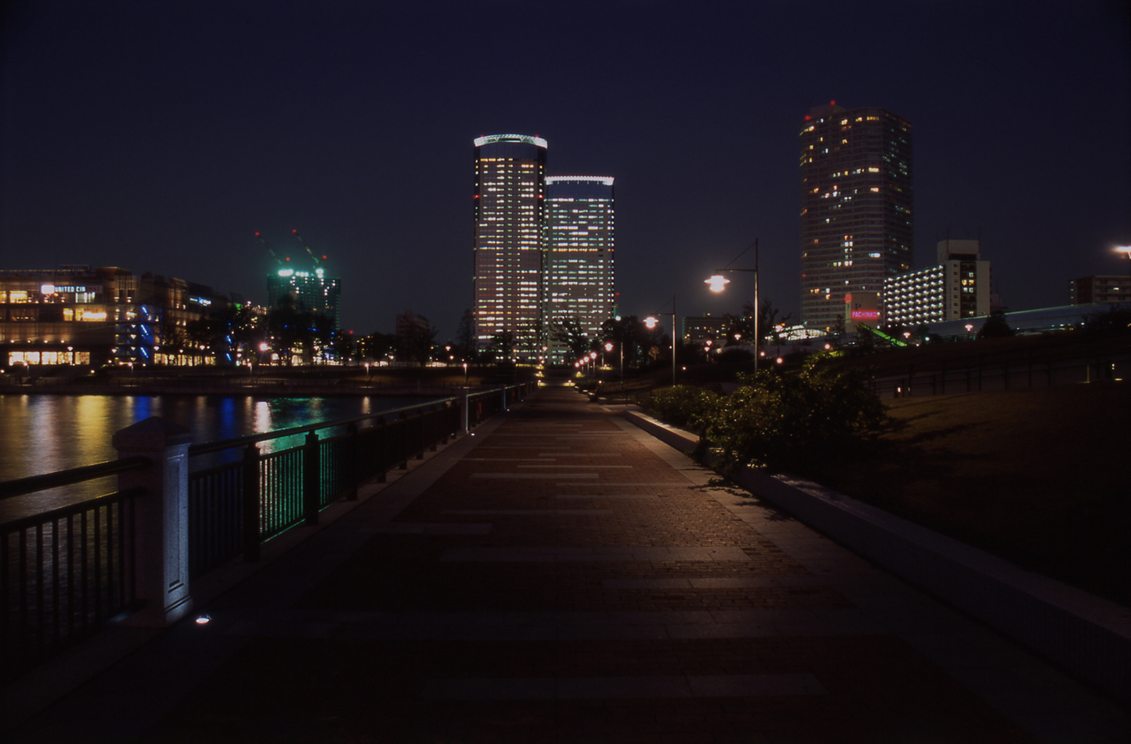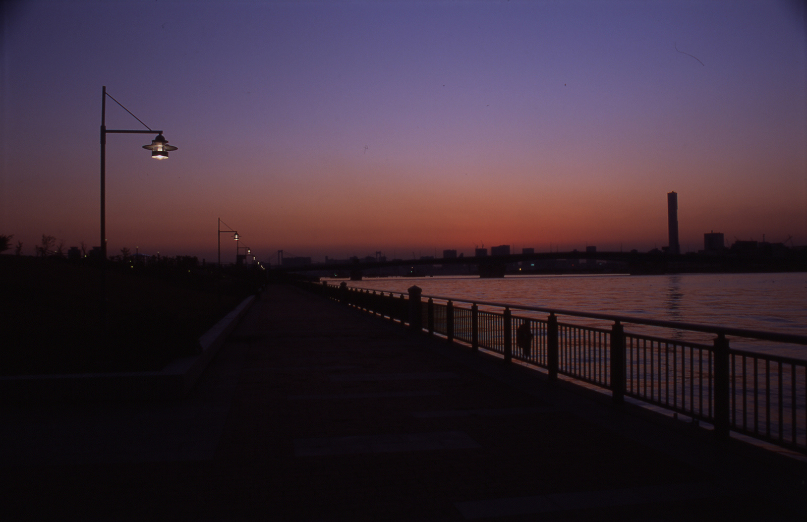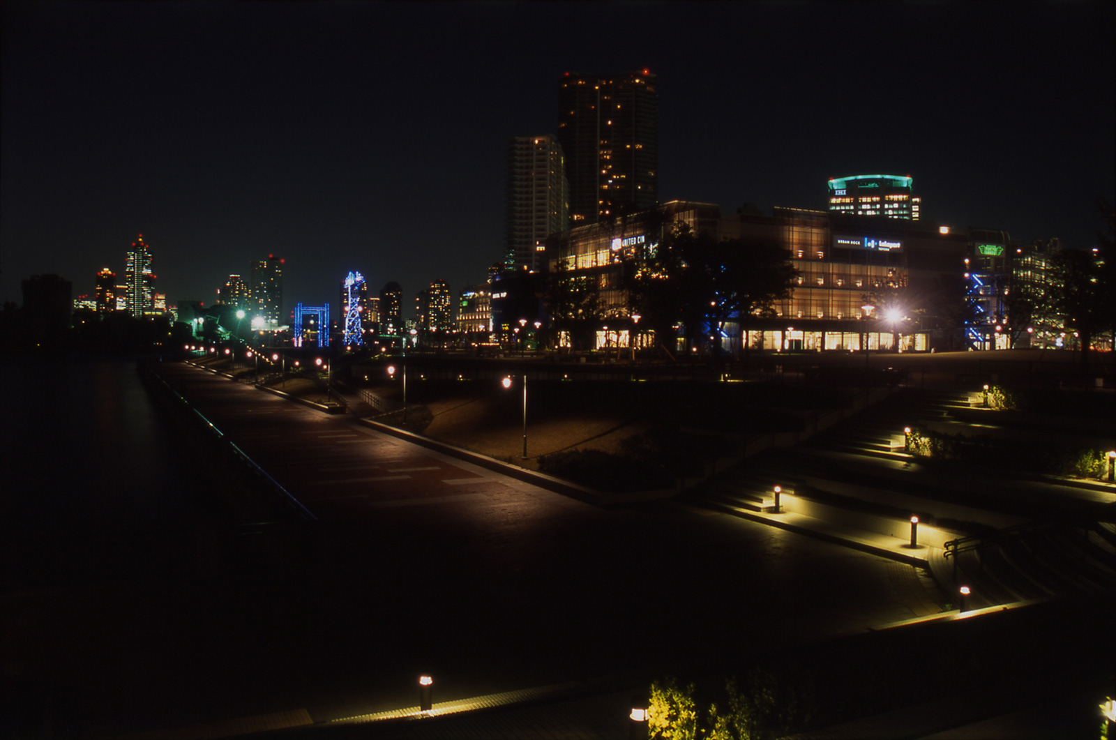 東京港の湾奥エリアにあたる豊洲が造船所から新たな生活・ビジネスの拠点に変わりつつある。海上公園は商業,住宅エリアが海に接するその先端部を縁取るように位置する公園である。ポール灯による連続感のある光と手摺支柱に絡めたアクセントの光が夕刻以降の散策に安全と心地よさを提供する。