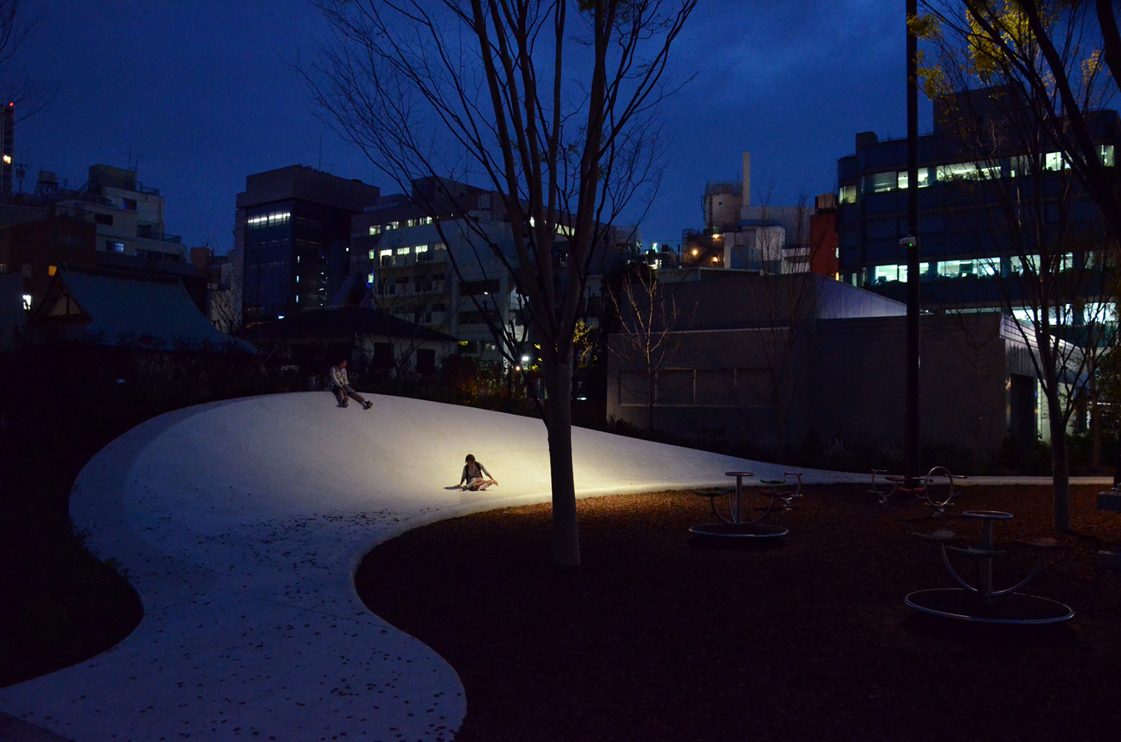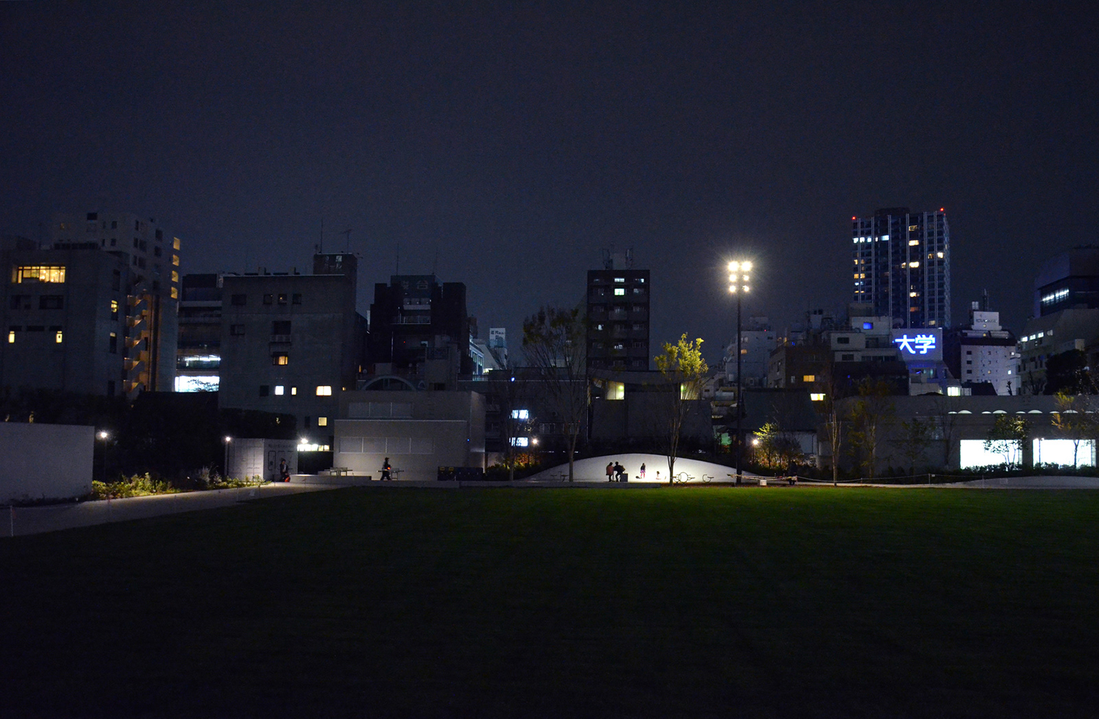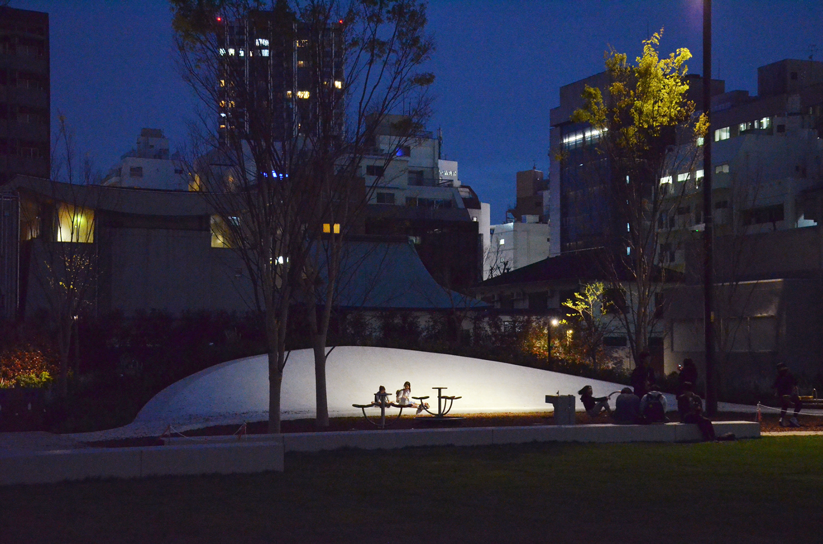 池袋駅から数分の立地にある南池袋公園が1期エリア(2015年)の部分開園を経て、グランドオープンを迎えた。当公園の特徴は都市のリビングと位置づけられた広大な芝生広場と賑わいを創出するカフェレストランである。カフェの売り上げの一部を地域貢献費として公園の運営に充当するなど公共施設の新たな仕組み作りも注目されている。夕刻を迎えると外周部に明かりが灯り始める。ウッドデッキのベンチ、手摺を利用した間接照明、既存樹である桜のライトアップなど。カフェレストランから滲み出す明かりはリビングの行灯的役割を果たしている。芝生広場を介して対面するリボンスロープ周辺は1本のハイポール+スポットライティングで浮かび上がり演出性と明るさを確保している。中央の広場に照明を設置せず、外周部の光で全体の安心を得ているのも当公園の特徴の一つである。