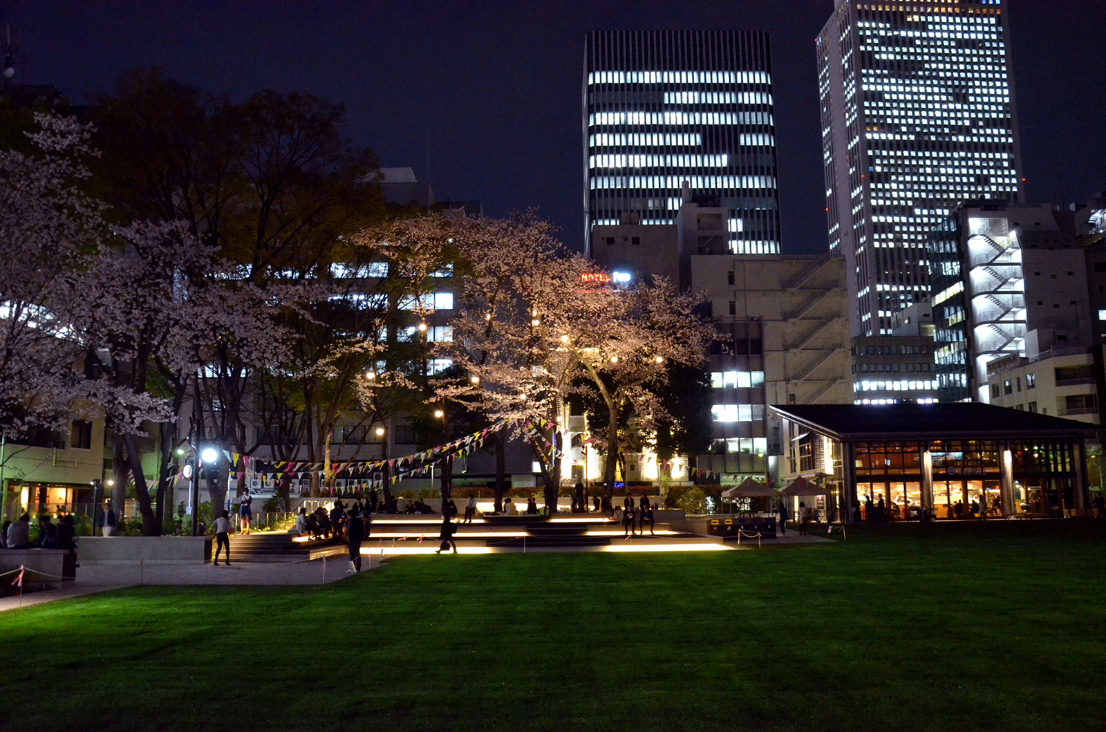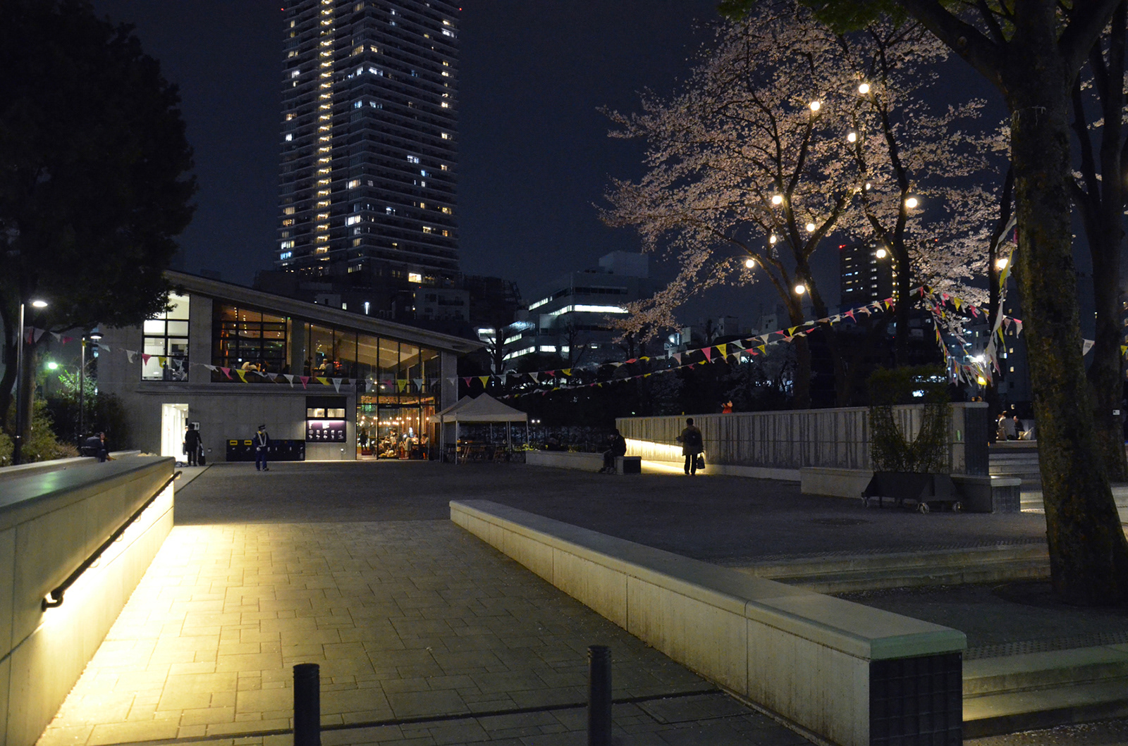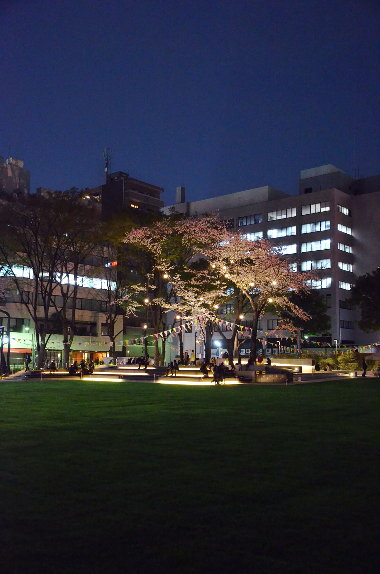 池袋駅から数分の立地にある南池袋公園が1期エリア(2015年)の部分開園を経て、グランドオープンを迎えた。当公園の特徴は都市のリビングと位置づけられた広大な芝生広場と賑わいを創出するカフェレストランである。カフェの売り上げの一部を地域貢献費として公園の運営に充当するなど公共施設の新たな仕組み作りも注目されている。夕刻を迎えると外周部に明かりが灯り始める。ウッドデッキのベンチ、手摺を利用した間接照明、既存樹である桜のライトアップなど。カフェレストランから滲み出す明かりはリビングの行灯的役割を果たしている。芝生広場を介して対面するリボンスロープ周辺は1本のハイポール+スポットライティングで浮かび上がり演出性と明るさを確保している。中央の広場に照明を設置せず、外周部の光で全体の安心を得ているのも当公園の特徴の一つである。