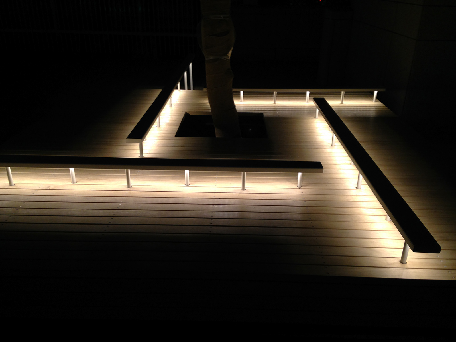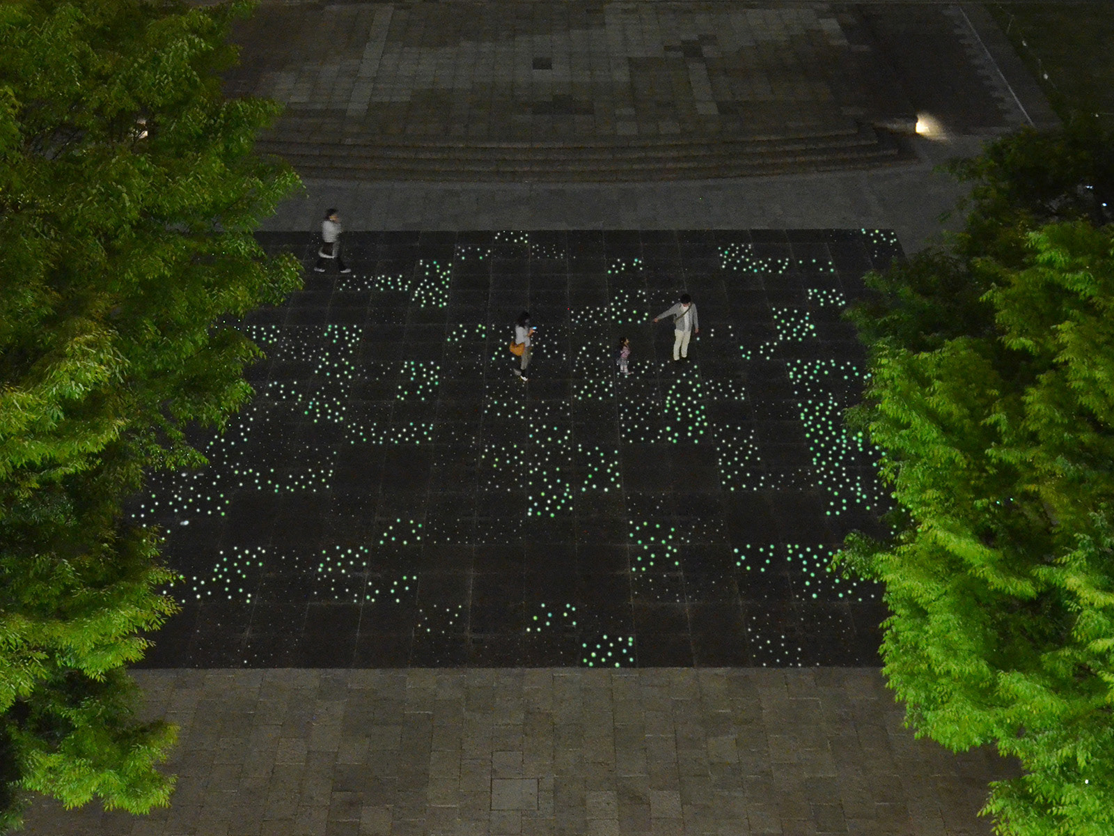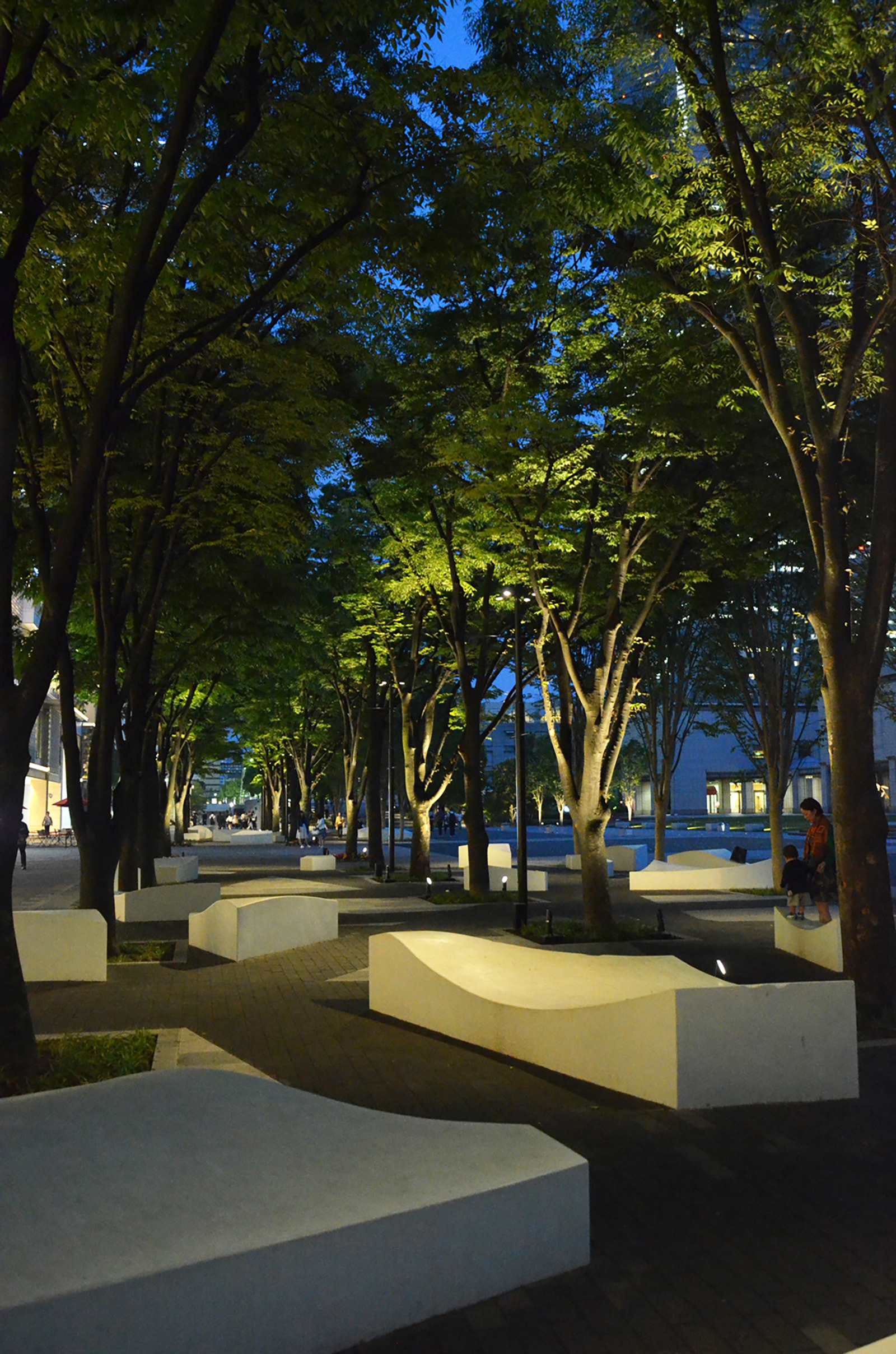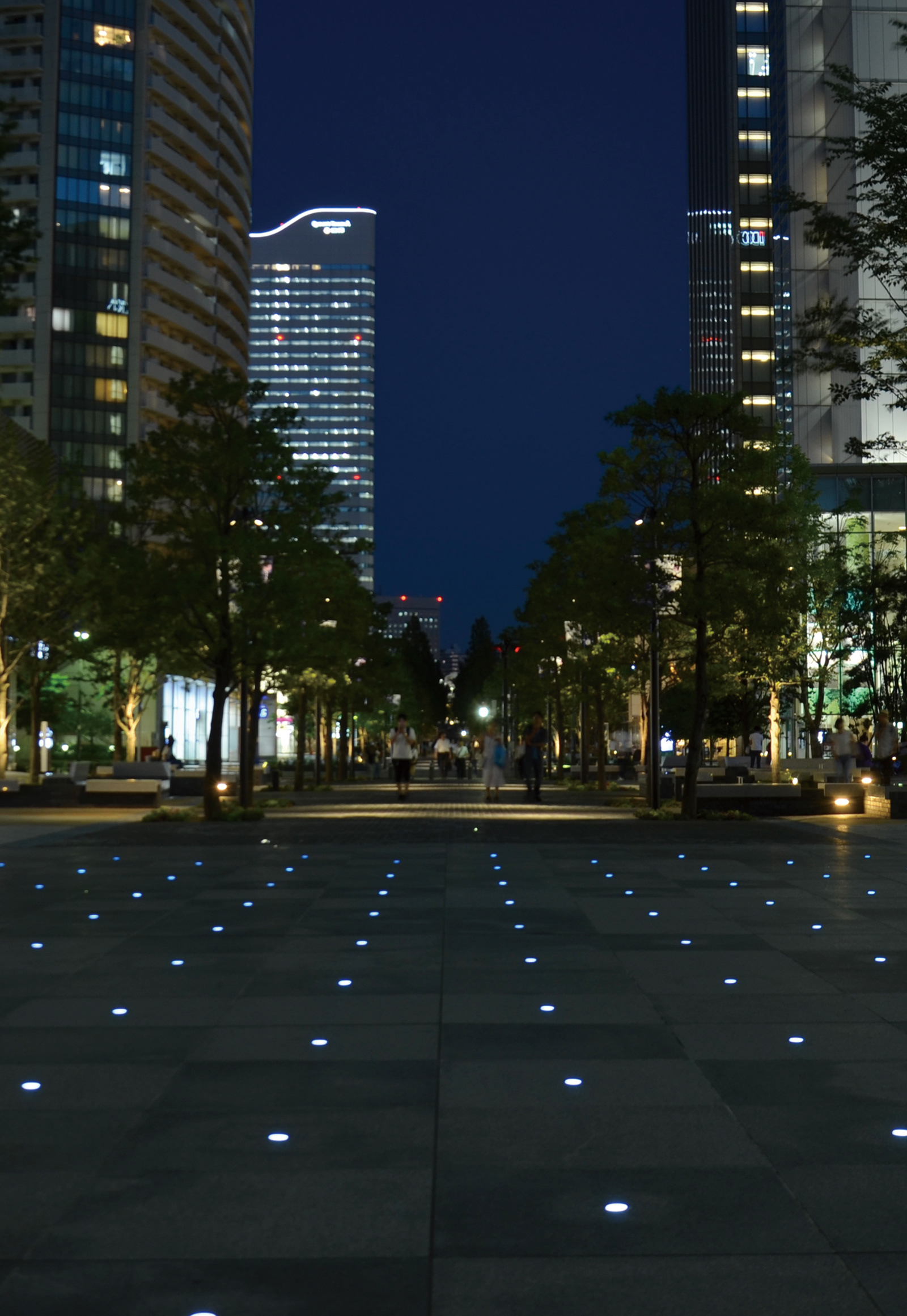 横浜みなとみらい地区は1989年に供用が開始され、4半世紀にわたり街区の整備が進められてきた。グランモール公園・美術の広場は供用開始時にはすでに完成を見ておりその後の街づくりの先導的役割を担ってきた。その間土地利用の変化や周辺街区の整備が進む中で公園の高度化が期待されてきた。横浜は夜の光が美しい街として広く知られるところであるが、みなとみらい地区の夜景の原点は美術の広場の夜光海ペーブ(デザイン:(株)石井幹子デザイン事務所)にある。床に漂う微粒な光をこの公園照明のDNAと位置づけ、全長700mに及ぶ長大な公園の光をきめ細かくプランしていった。まず夜光海ペーブはオリジナルデザインを尊重しながらすべての部品を刷新し長く親しまれる公園の礎とした。美術館前に新設された水系施設、緑陰エリアのファニチュアを生かした照明などで休息の明かりを創出した。年度をまたぎ3つのゾーンが続けて整備された。公園の軸性を表す複合柱にはスポットライトが備えられ、ファニチュア照明とともにそぞろ歩きを促す光環境となっている。長い公園の途中には2つの広場が設けられ、整然と並ぶ床の光が年間プログラムにより演出されている。普段の光と様々なイベントに対応した光が連続空間の節目を彩っている。