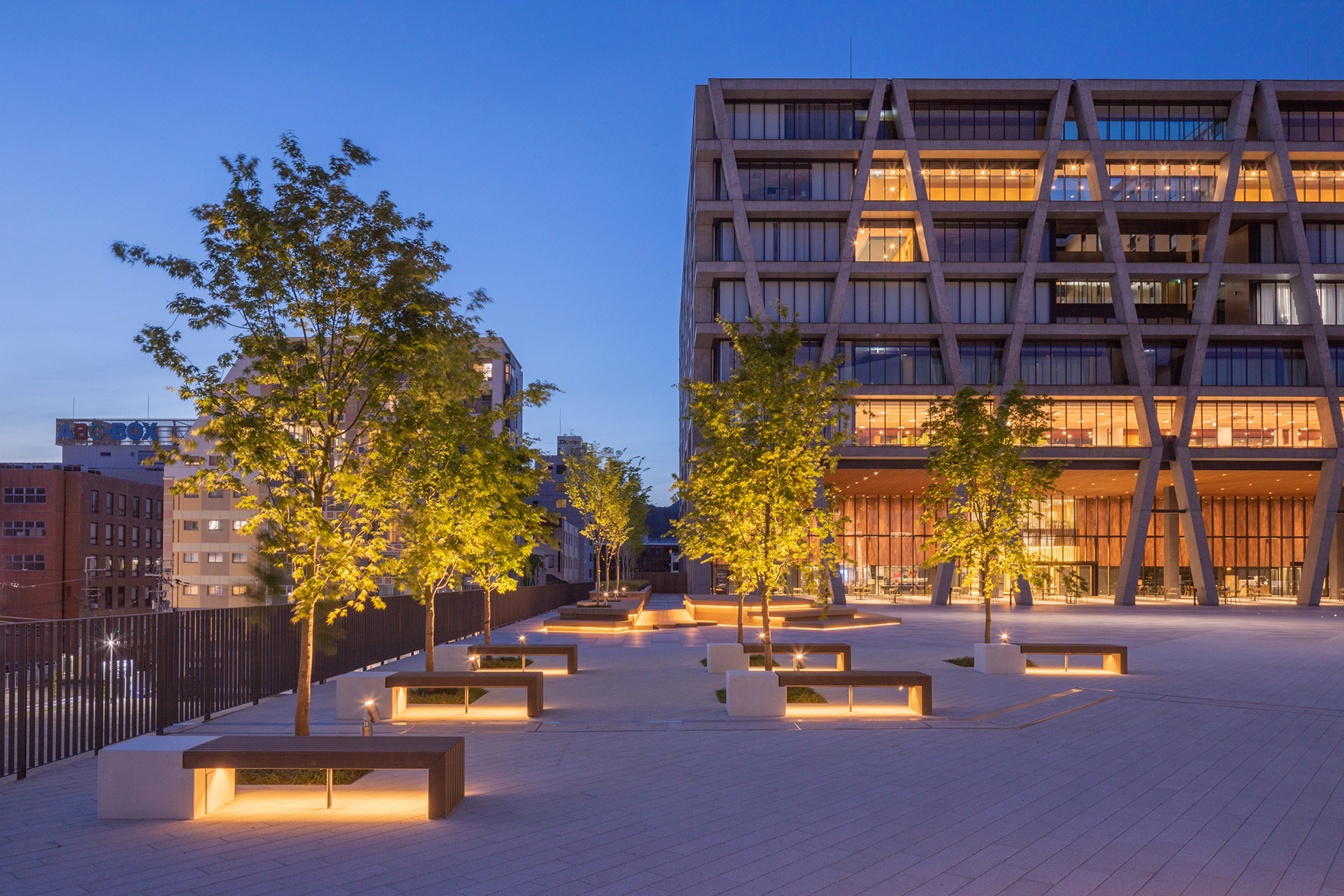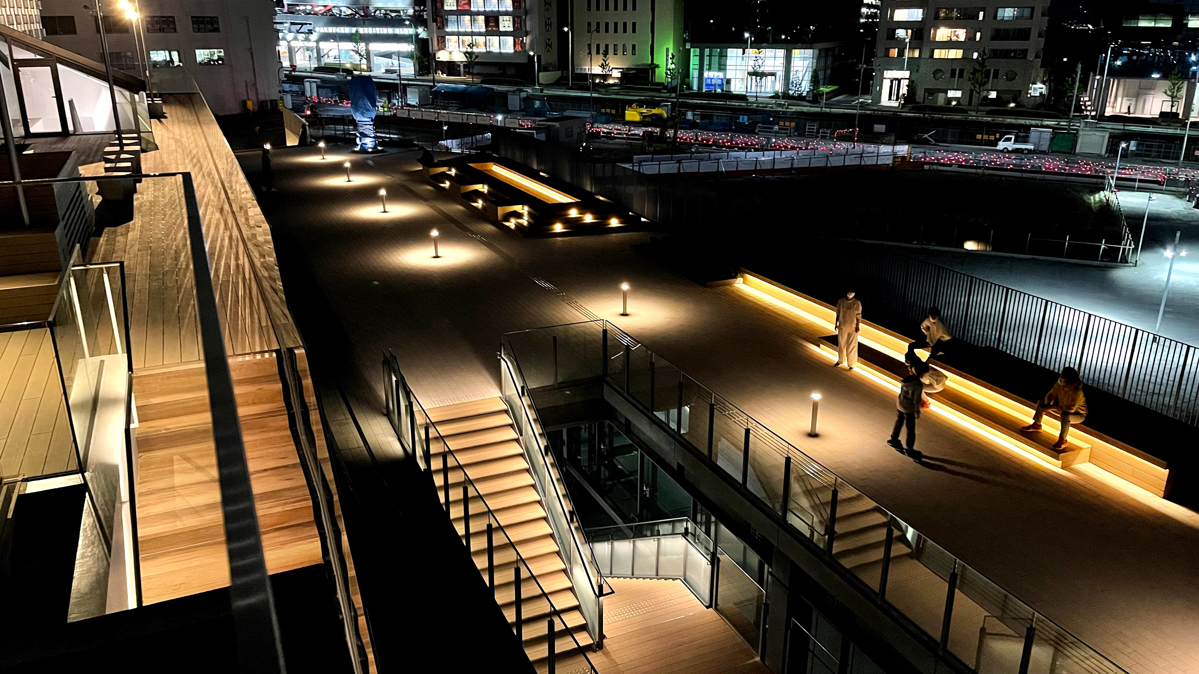 当地区は新駅建設に伴い、大学、図書館など文教施設が建設され、新たな文化・学術エリアとして整備された。船場広場(箕面市船場東地区)はこれら周辺施設をつなぐようにペデストリアンデッキとして計画・建設された。通路機能を主体としながらも各所に休息エリアを設けさまざまなアクティビティに対応できる空間づくりがなされている。光を目線より低い位置に配することを基本とし、ボラードで軸を形成、階段の手摺、ベンチ下などに照明を施し人の行動を促すことに主眼を置いた。南端の広場はグリッド状に光のドットを配するゾーンに加え建物からのフォーカススポットで照射し演出している。