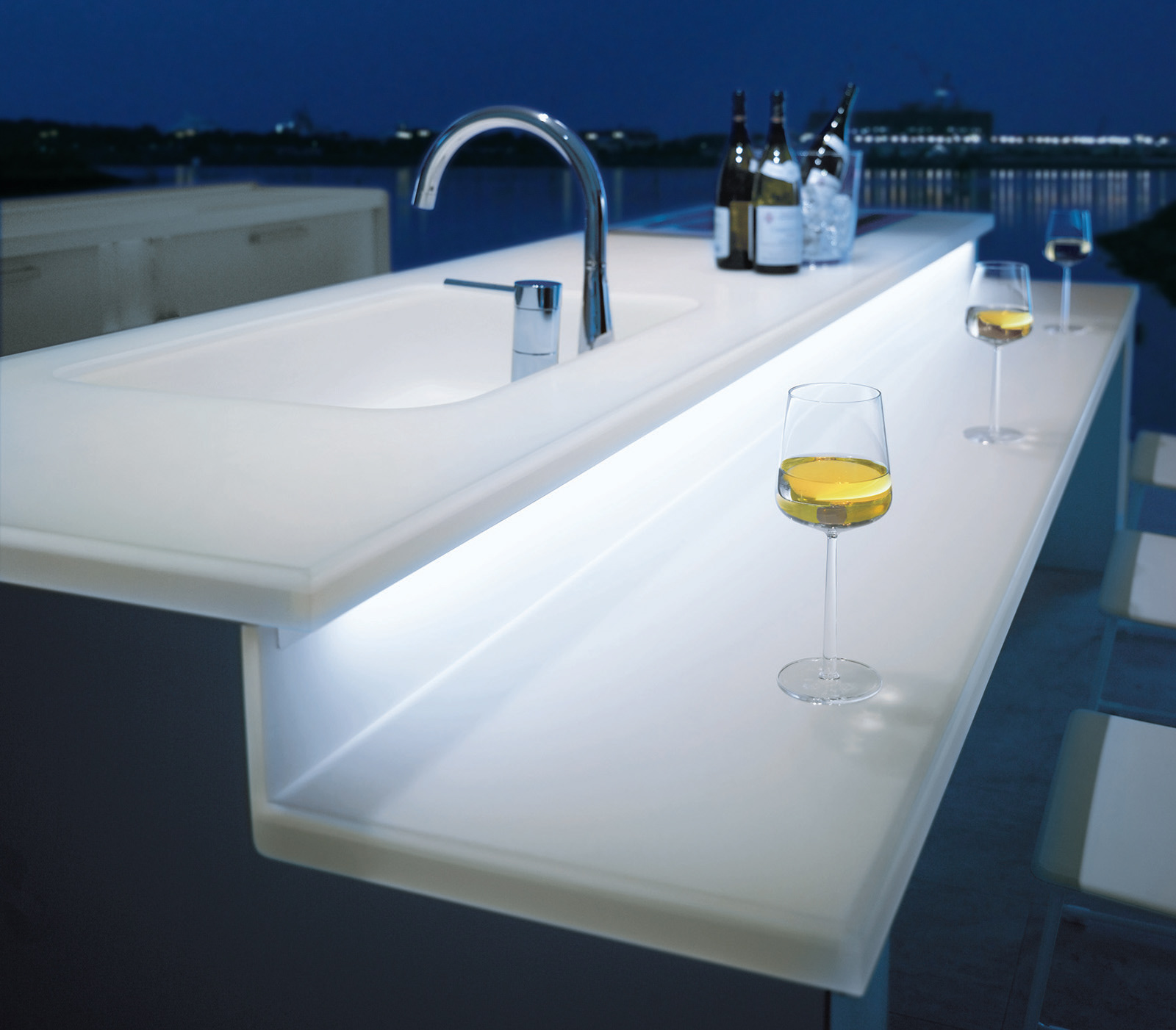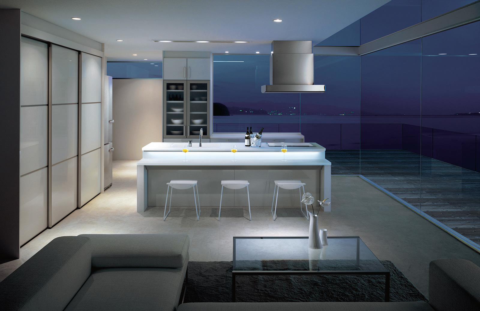 TOTOのキュイジアシリーズはクリスタルな質感の水回り機器として、良質な家具を凌駕するほどのクオリティを有する。テーブルトップに間接の明かりを伴うことで機器が新たなライフスタイルを示唆する家具となり、微量な電力で充分な効果を発揮するLEDは新たな用途を拡げる。